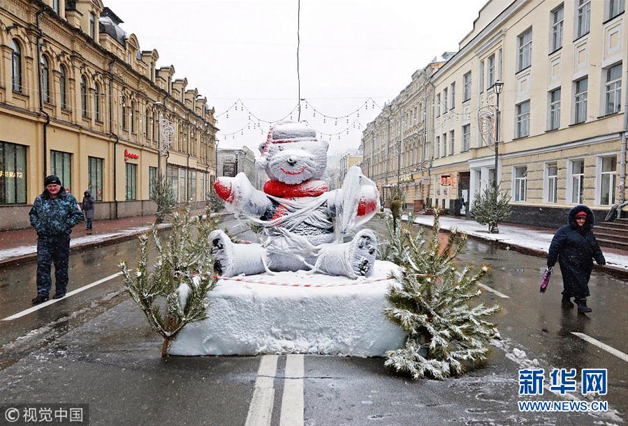 当地时间2018年12月12日,乌克兰首都基辅的Petra Sahaidachnoho大街,一只泰迪熊伫立在这里。在经历一段12月中旬不寻常的温暖天气后,当地迎来了降雪。此轮降雪将在本周末结束。(图片来源:视觉中国)