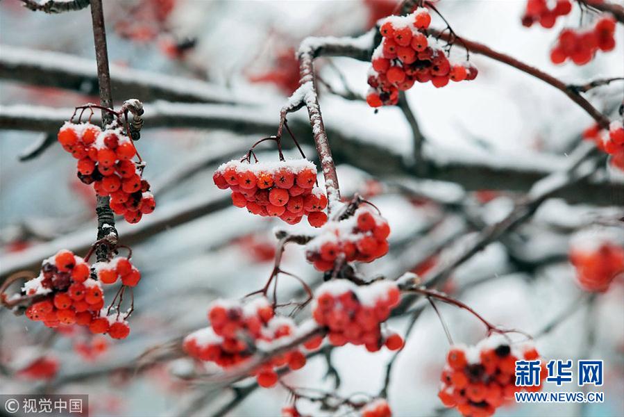 当地时间2018年12月12日,乌克兰首都基辅,雪花覆盖在欧洲花楸的果实上。在经历一段12月中旬不寻常的温暖天气后,当地迎来了降雪。此轮降雪将在本周末结束。(图片来源:视觉中国)