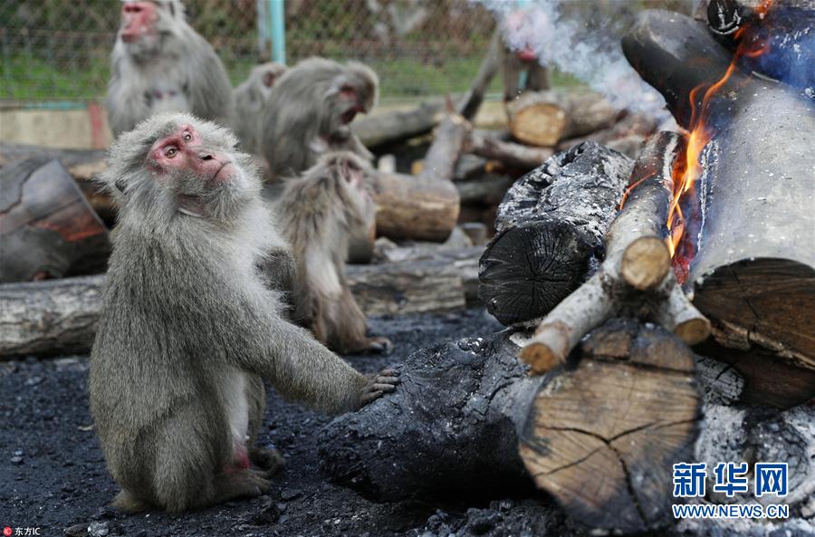 当地时间2018年12月19日,日本爱知县犬山市,日本猿猴中心内的猴子们围在篝火旁取暖。(图片来源:东方IC)