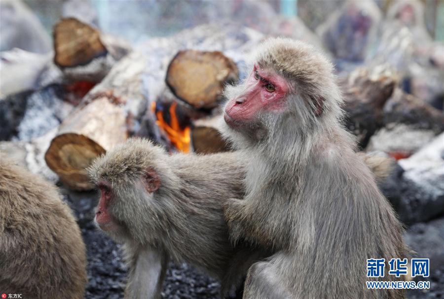 当地时间2018年12月19日,日本爱知县犬山市,日本猿猴中心内的猴子们围在篝火旁取暖。(图片来源:东方IC)