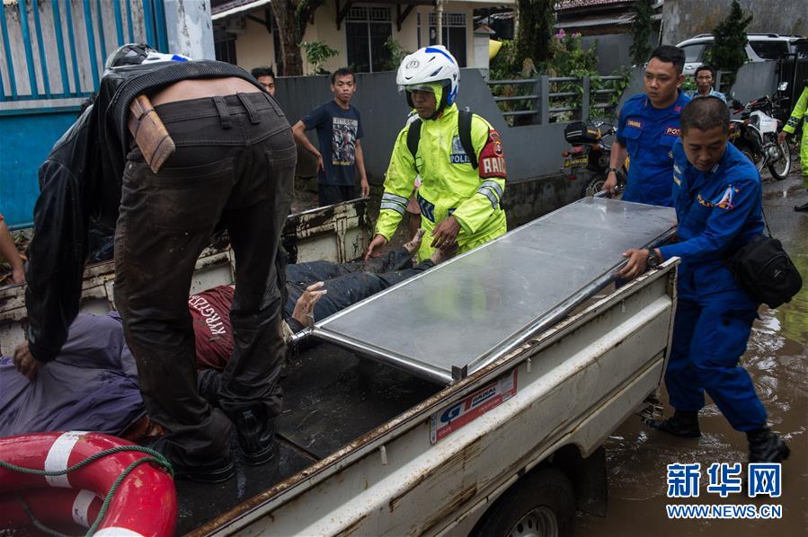 12月23日,在印度尼西亚万丹省板底兰,救援人员在运送遇难者遗体。印度尼西亚抗灾署23日晚说,该国西部巽他海峡22日晚发生的海啸造成的遇难者人数已升至222人。 新华社发(维里 摄)