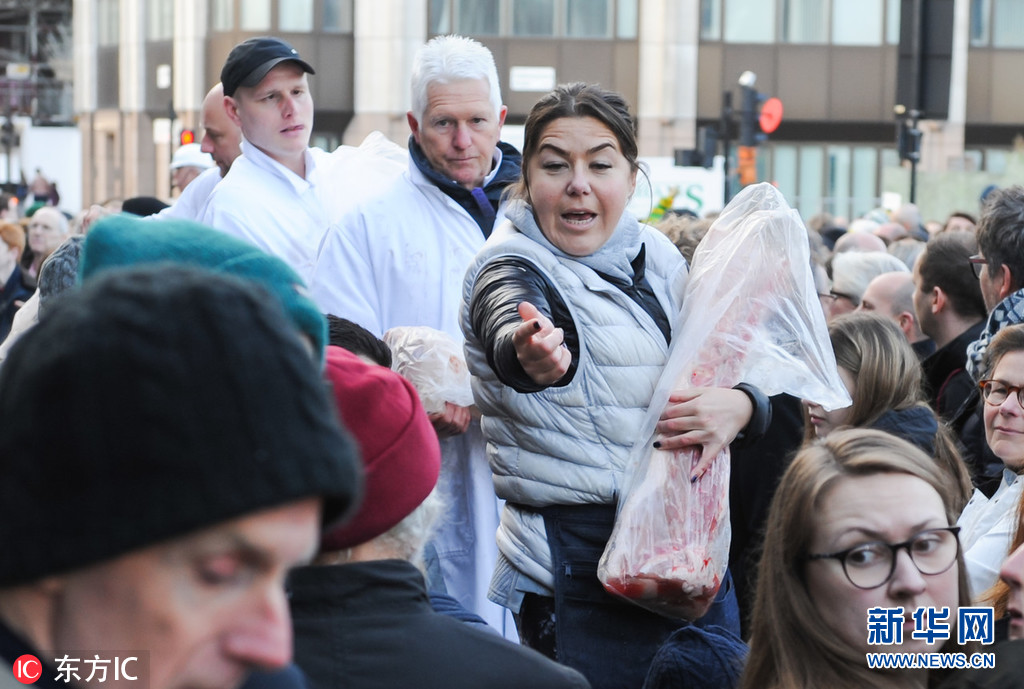 当地时间2018年12月24日,英国伦敦,伦敦史密斯菲尔德肉类市场在平安夜举行肉食拍卖活动,引民众争相抢购。(图片来源:东方IC)