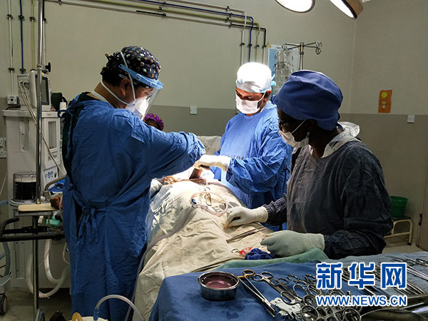 这张2018年8月21日拍摄的照片显示,在马拉维首都利隆圭的卡姆祖中心医院,中国医疗队妇产科医生为当地民众实施手术。新华社发(第六批中国援马拉维医疗队供图)