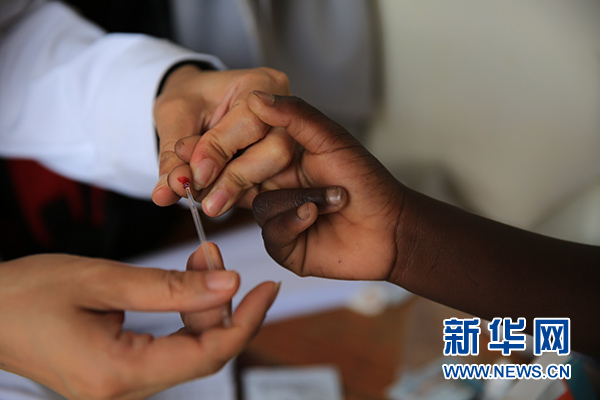 这张2018年12月8日拍摄的照片显示,在马拉维南部布兰太尔市卡迪迪村卫生院,第六批中国援马拉维医疗队医生在义诊活动中为当地居民检测疟疾。新华社发(樊江波 摄)