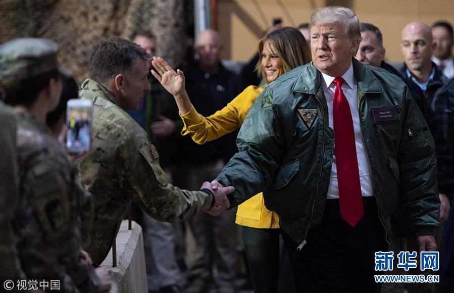 当地时间2018年12月26日,伊拉克阿萨德空军基地,美国总统特朗普偕夫人梅拉尼娅,于圣诞节后对伊拉克进行了突访,并与美国在当地的政治和军事人员会面。(图片来源:视觉中国)