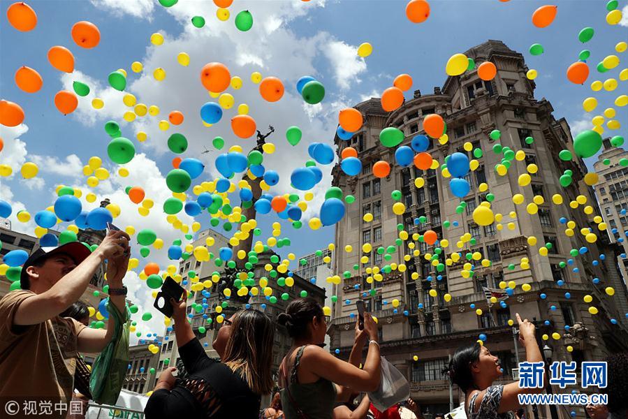 当地时间2018年12月28日,巴西圣保罗,年终庆祝活动上,圣保罗市中心放飞彩色气球。(图片来源:视觉中国)