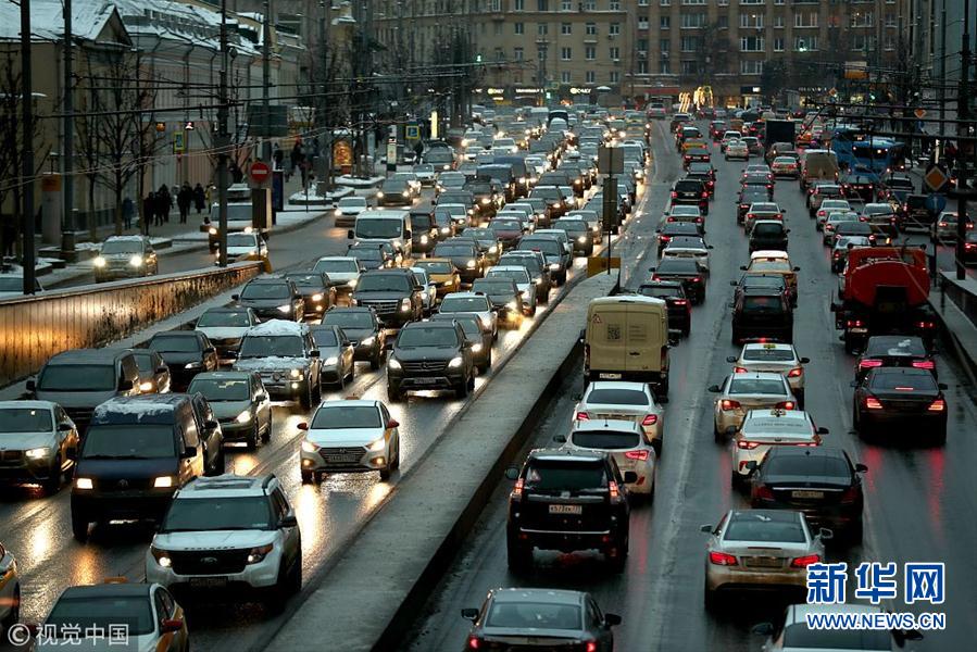 新年将至 莫斯科街头出现交通堵塞车辆排起长龙