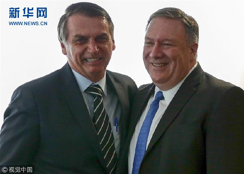 当地时间2019年1月2日,巴西巴西利亚,美国国务卿蓬佩奥与巴西新上任总统博索纳罗会面。(图片来源:视觉中国)