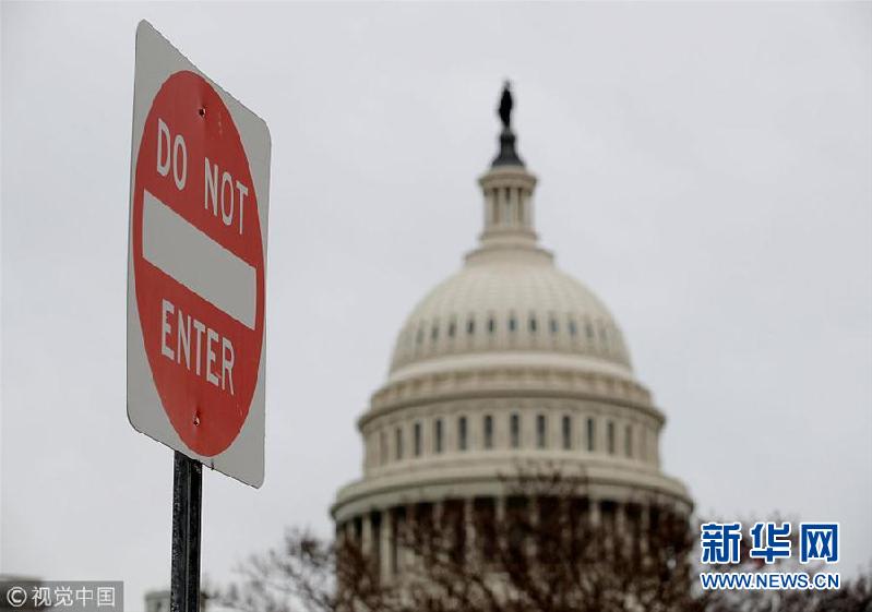 当地时间2019年1月7日,美国华盛顿,美国国会。因美国国会两党仍无法就临时拨款法案和美墨边界墙问题达成一致,截至7日,美国部分联邦政府机构的停摆状态已进入第三周。有白宫高级官员6日透露,由于谈判持续僵持,美国总统特朗普现在已经倾向于宣布国家进入紧急状态。(图片来源:视觉中国)