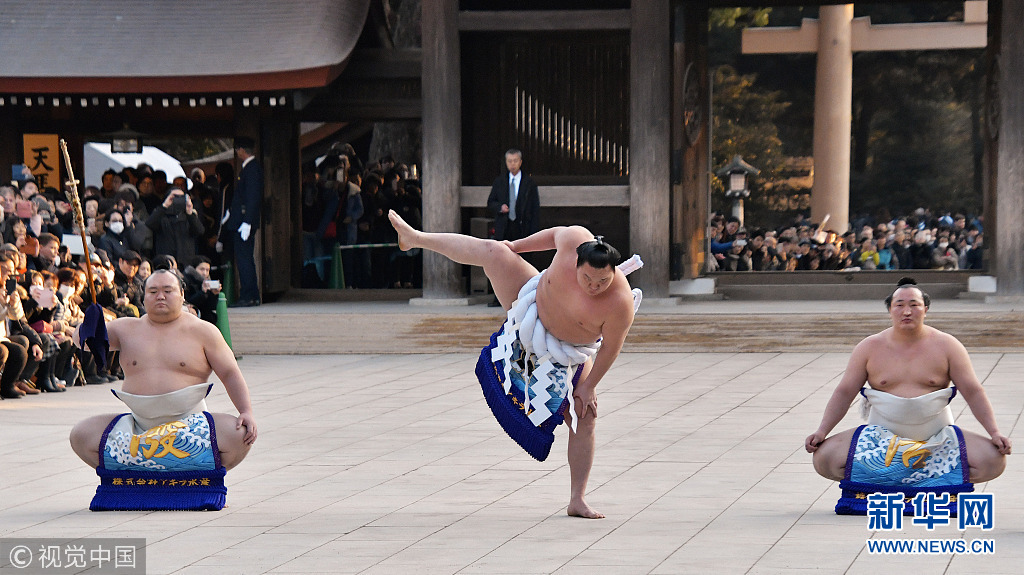 2019年1月8日,日本东京,日本明治神宫举行新年活动,相扑选手在庆祝新年的典礼上表演。当天,众多相扑爱好者来到明治神宫观看每年一度的新年相扑表演。(图片来源:视觉中国)