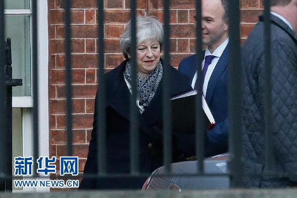 1月14日,在英国伦敦,英国首相特雷莎·梅(左)离开唐宁街10号准备前往议会下院。 新华社发(蒂姆·爱尔兰摄)