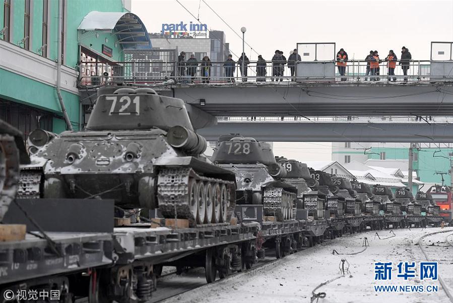当地时间2019年1月16日,俄罗斯新西伯利亚火车站,俄罗斯军人举行仪式欢迎老挝移交T-34坦克给俄罗斯。(图片来源:视觉中国)