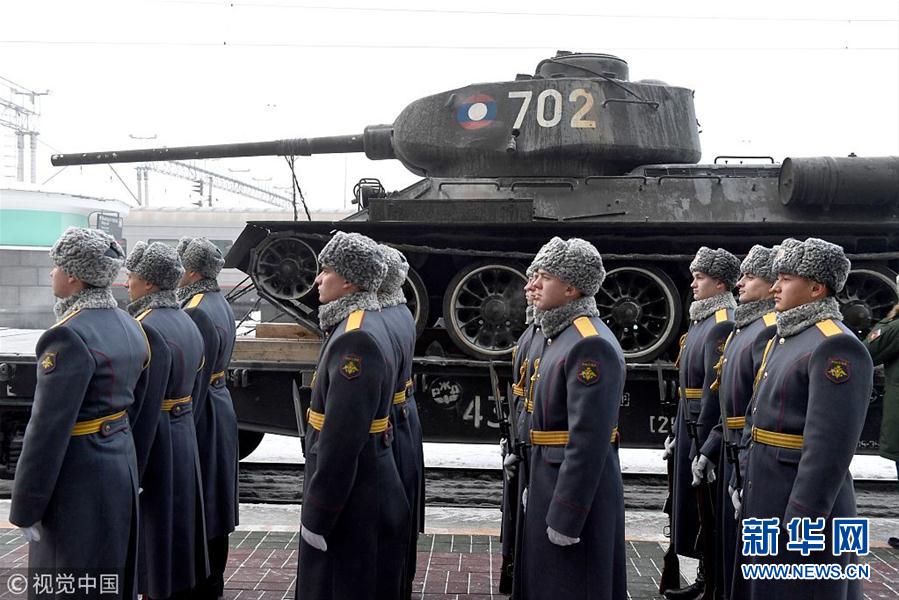 当地时间2019年1月16日,俄罗斯新西伯利亚火车站,俄罗斯军人举行仪式欢迎老挝移交T-34坦克给俄罗斯。(图片来源:视觉中国)