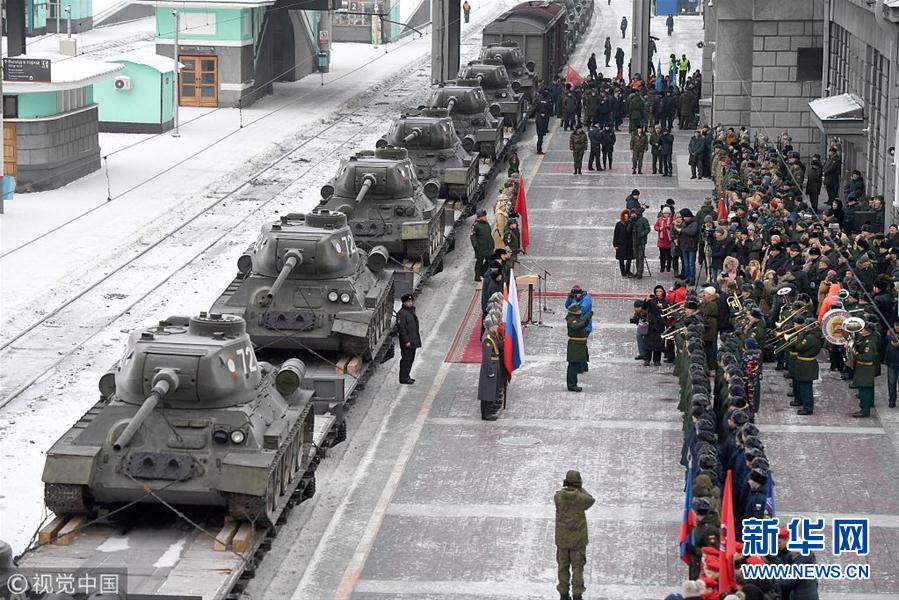当地时间2019年1月16日,俄罗斯新西伯利亚火车站,俄罗斯军人举行仪式欢迎老挝移交T-34坦克给俄罗斯。(图片来源:视觉中国)