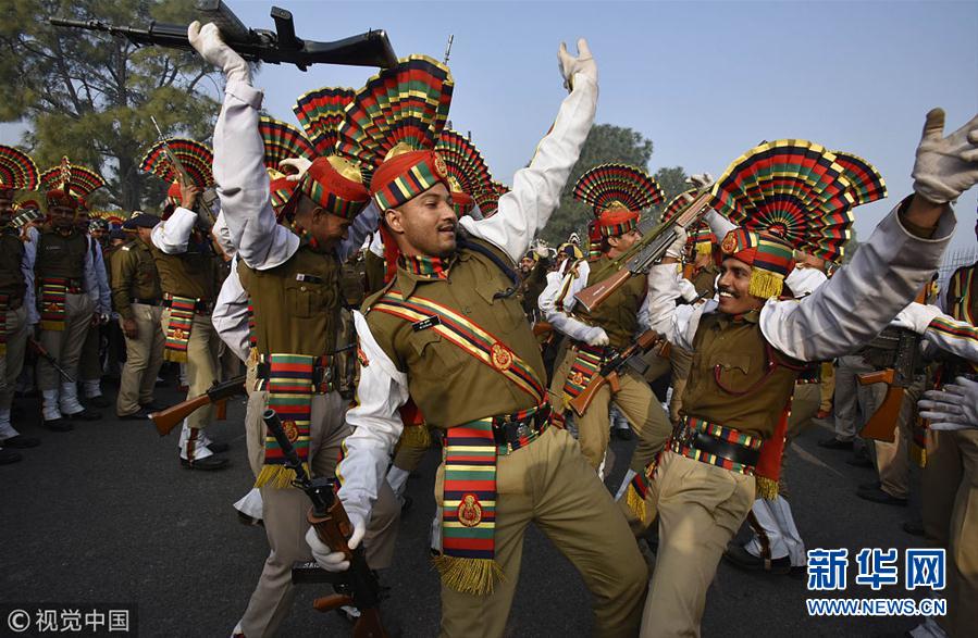 当地时间2019年1月18日,印度新德里,印度士兵参加共和日阅兵彩排。(图片来源:视觉中国)