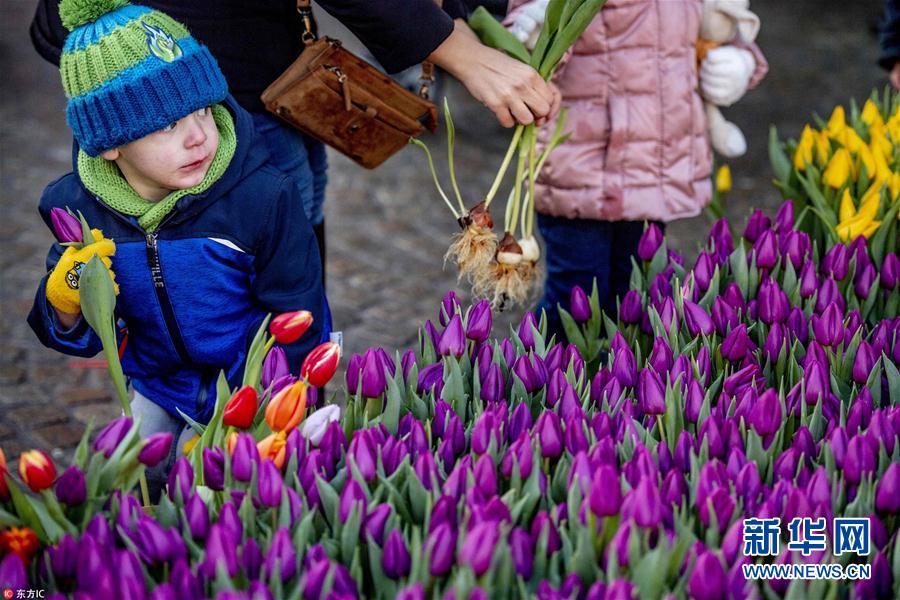 当地时间2019年1月19日,荷兰阿姆斯特丹,荷兰庆祝全国郁金香日,民众在阿姆斯特丹市的水坝广场免费挑选郁金香。(图片来源:东方IC)
