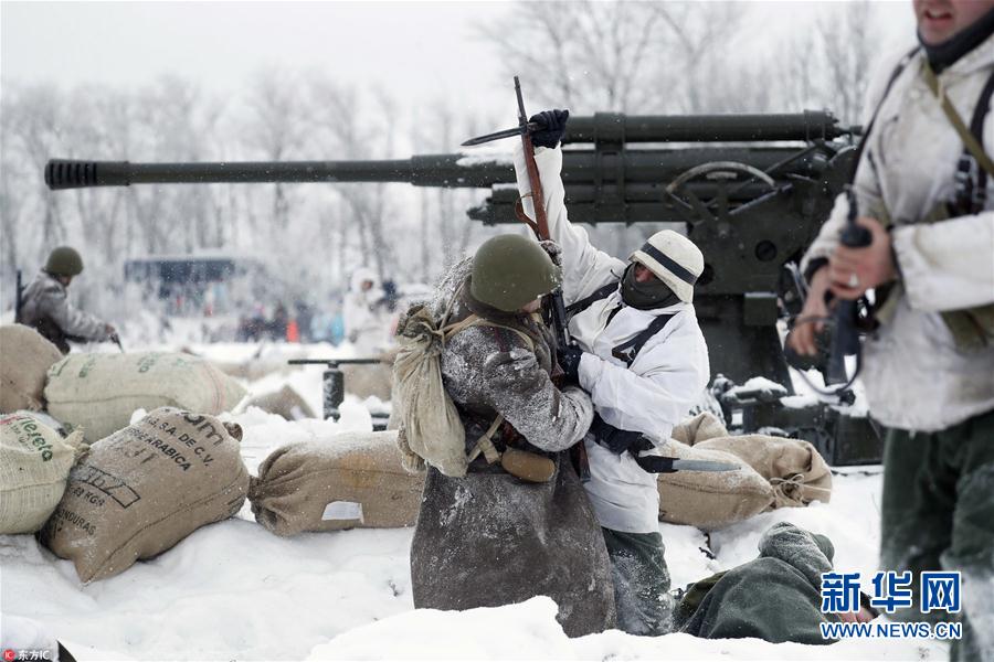 当地时间2019年1月19日,俄罗斯圣彼得堡,历史军事俱乐部成员穿上苏联红军和纳粹士兵制服,重演二战战争场景,纪念列宁格勒保卫战结束75周年。俄罗斯将于1月27日纪念列宁格勒围城战结束75周年。(图片来源:东方IC)