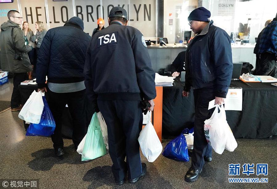 当地时间2019年1月22日,美国纽约布鲁克林,运输安全管理局(TSA)的雇员在巴克莱中心领取免费食物。纽约食品银行正在为因政府关闭而受到影响的联邦工作人员分发食品。(图片来源:视觉中国)