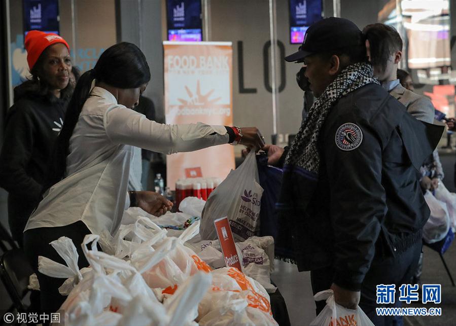 当地时间2019年1月22日,美国纽约布鲁克林,运输安全管理局(TSA)的雇员在巴克莱中心领取免费食物。纽约食品银行正在为因政府关闭而受到影响的联邦工作人员分发食品。(图片来源:视觉中国)
