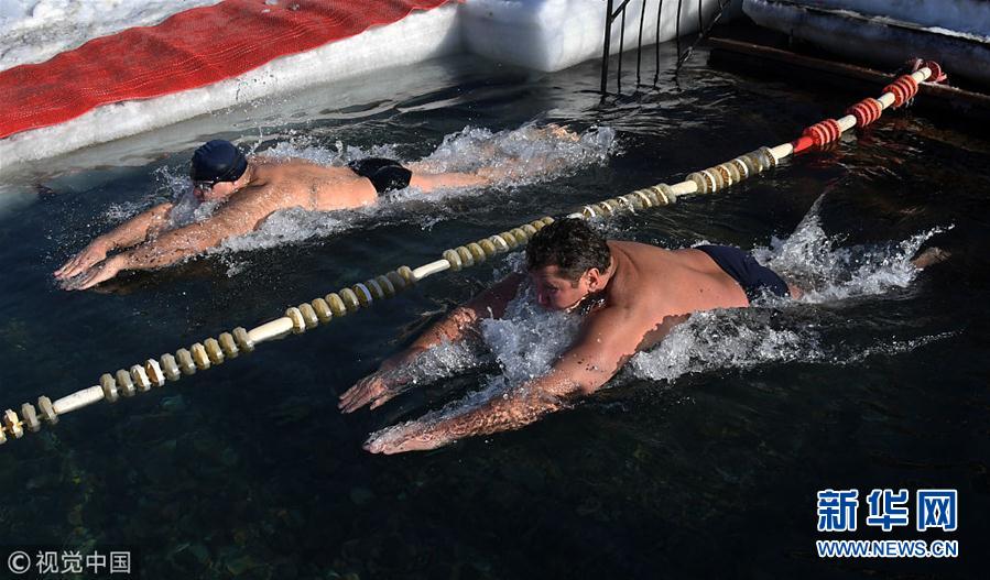 俄罗斯民众参加冬泳比赛 冰水中奋勇向前