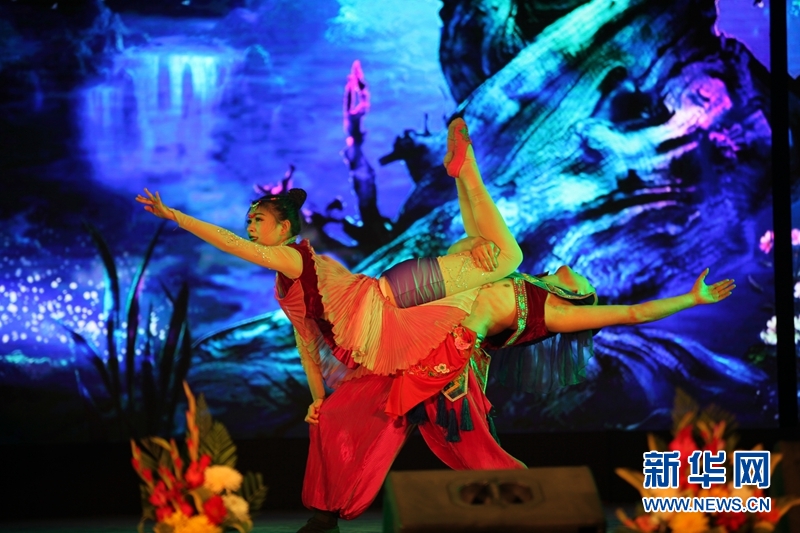 1月27日,在尼泊尔加德满都市中心的尼军俱乐部内,魅力文旅发展有限公司的演员在表演舞蹈《相爱山水间》。当天,尼泊尔中国文化中心和中国湖南省文化和旅游厅联合主办“欢乐春节·锦绣潇湘”为主题的演出,吸引了数百人前来观看,反响热烈。新华社记者周盛平摄