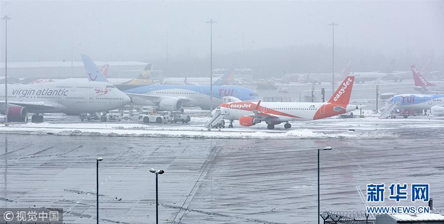 当地时间2019年1月30日,英国,由于冰雪天气,曼彻斯特机场的飞机停飞。当日,兰开夏郡和大曼彻斯特郡发布了冰雪黄色预警。(图片来源:视觉中国)