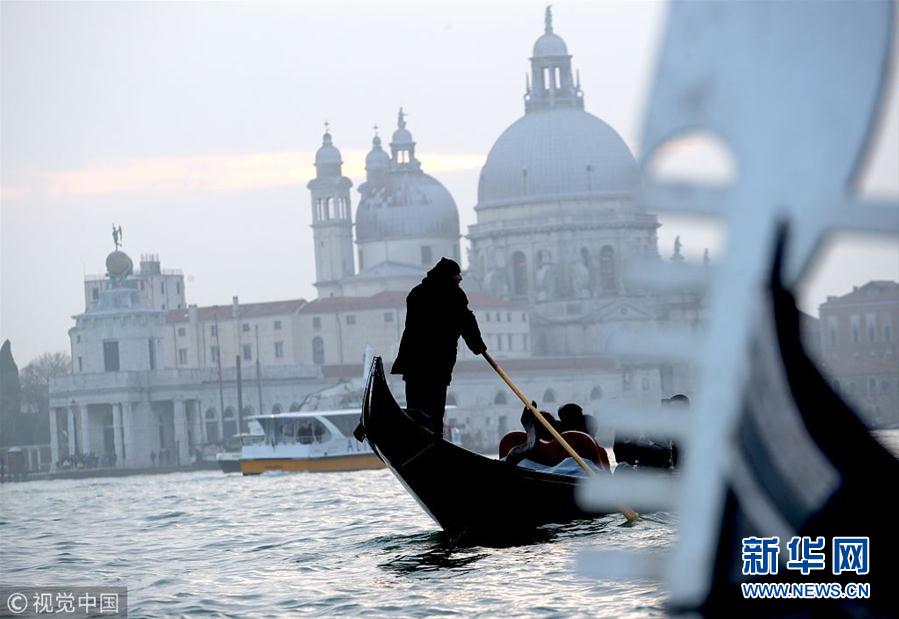 当地时间2019年2月3日,意大利威尼斯,一位工作人员在用贡多拉为游客服务。(图片来源:视觉中国)