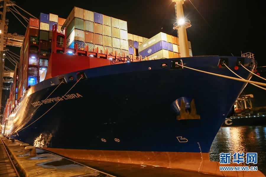 这是2月5日在比利时安特卫普港拍摄的“中远海运天秤座”号超大型集装箱船。新华社记者张铖摄