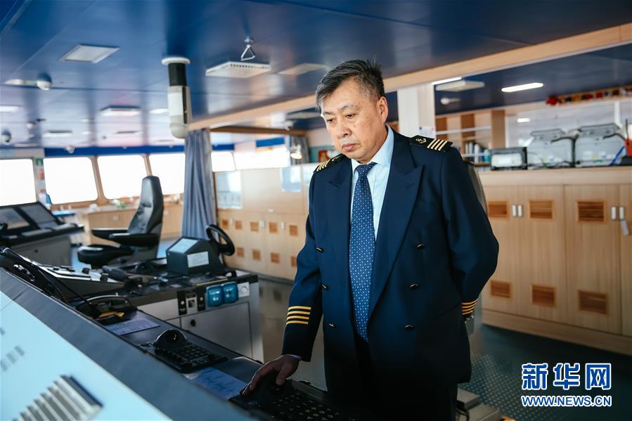 2月5日,在比利时安特卫普港,“中远海运天秤座”号船长顾明章在驾驶室检查设备。 新华社记者张铖摄