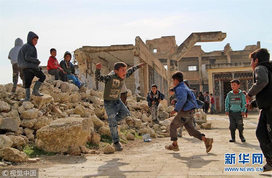 当地时间2019年2月4日,叙利亚伊德利卜Kufayr村庄,孩子们在遭到部分毁坏的学校中上课玩耍。 (图片来源:视觉中国)