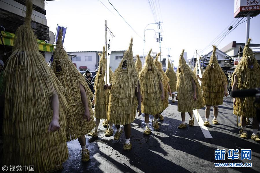 当地时间2019年2月11日,日本山形县上山市,人们庆祝“Kasedori节”,参与者身穿鸟形稻草衣徒步前往村庄表演舞蹈,祈求五谷丰登和好运,当地人则拿着水桶和勺子在街上等着向表演者泼冷水。(图片来源:视觉中国)
