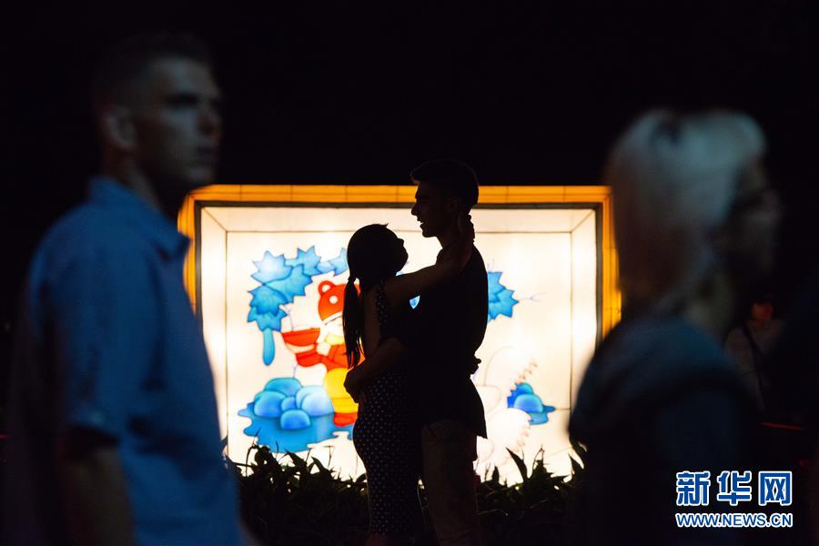 2月14日,在新西兰奥克兰的元宵灯节上,一对情侣在彩灯前拥抱。 新华社发(李桥桥摄)