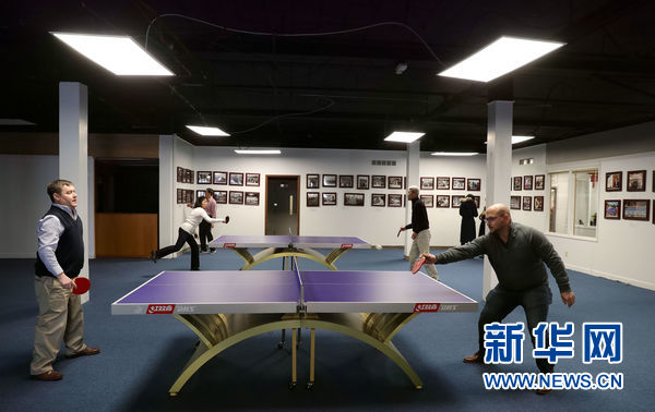 2月15日,在位于美国马斯卡廷的中美民间友好交流中心,当地民众打乒乓球。 汪平 摄
