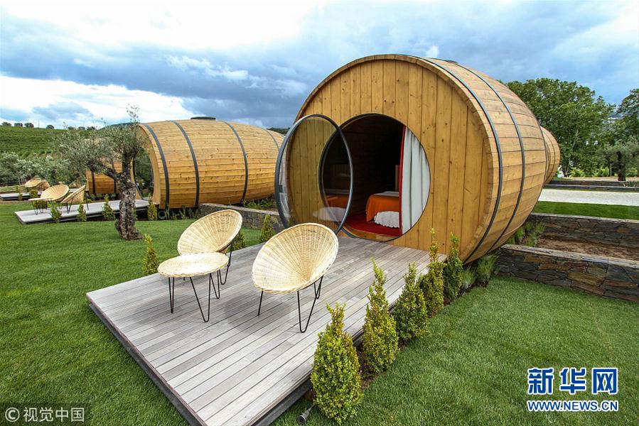 2019年2月18日讯(具体拍摄时间不详),葡萄牙杜罗,保罗·佩雷拉和玛丽亚-阿尔维斯设计了10间用松木建造的套房,它们看起来像是巨型木桶。这些桶形酒店套房的价格为每晚250欧元。(图片来源:视觉中国)