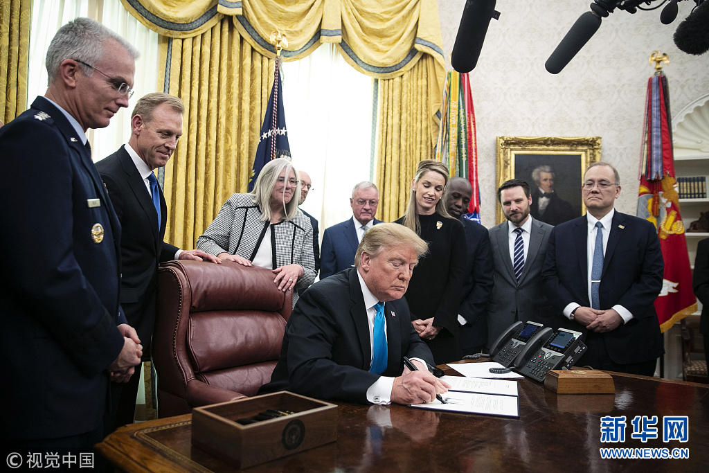 当地时间2019年2月19日,美国华盛顿,美国总统特朗普在白宫椭圆形办公室签署“第4号航天政策指令”(SPD-4),旨在创建美军第六个军种——太空部队。(图片来源:视觉中国)