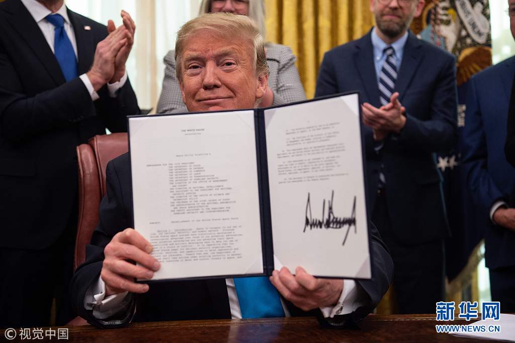 当地时间2019年2月19日,美国华盛顿,美国总统特朗普在白宫椭圆形办公室签署“第4号航天政策指令”(SPD-4),旨在创建美军第六个军种——太空部队。(图片来源:视觉中国)