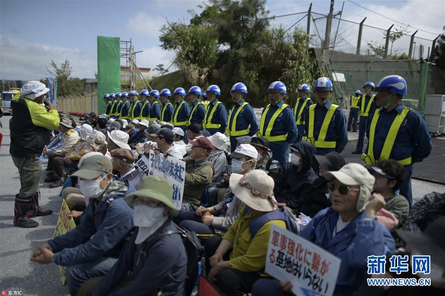 当地时间2019年2月21日,日本冲绳县名护市,当地示威者在施瓦布营门口静坐抗议,阻止日本政府动用建筑车辆通过,反对在边野古建设新基地。24日(周日),冲绳将就美军普天间机场搬迁至该县名护市边野古进行公投。(图片来源:东方IC)