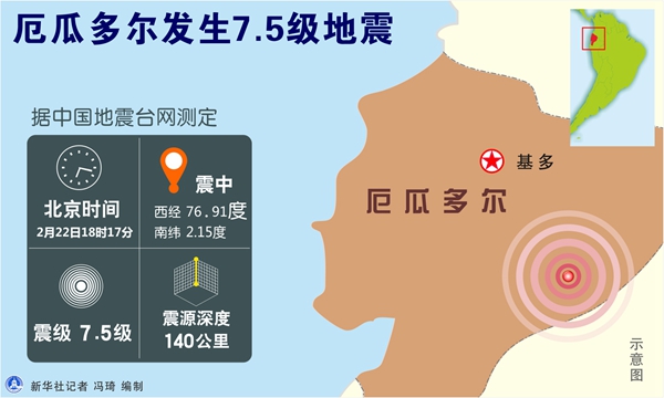 新华社北京2月22日电 据中国地震台网正式测定,北京时间2019年2月22日18时17分,在厄瓜多尔(南纬2.15度,西经76.91度)发生7.5级地震,震源深度140千米。