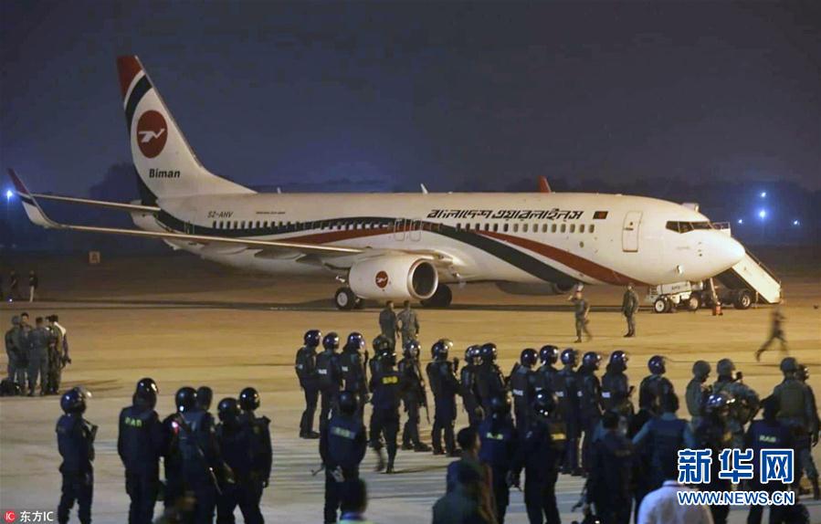当地时间2019年2月24日,孟加拉国吉大港机场,警察包围遭劫持的客机。据媒体报道,孟加拉国航空公司一架从达卡经吉大港飞往迪拜的客机起飞后遭劫持,在该国吉大港市的机场紧急迫降。机上142名乘客首先撤离,1名男性嫌疑人和7名机组成员滞留在客机上,特种部队随后控制了客机,劫机事件的嫌疑人被特种部队击伤后不治身亡。(图片来源:东方IC)