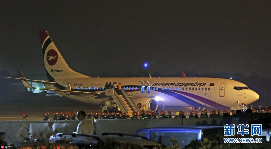 当地时间2019年2月24日,孟加拉国吉大港机场,遭劫持的客机。据媒体报道,孟加拉国航空公司一架从达卡经吉大港飞往迪拜的客机起飞后遭劫持,在该国吉大港市的机场紧急迫降。机上142名乘客首先撤离,1名男性嫌疑人和7名机组成员滞留在客机上,特种部队随后控制了客机,劫机事件的嫌疑人被特种部队击伤后不治身亡。(图片来源:东方IC)