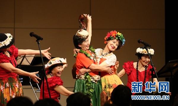当地民众表演夏威夷草裙舞。新华网记者 彭纯 摄