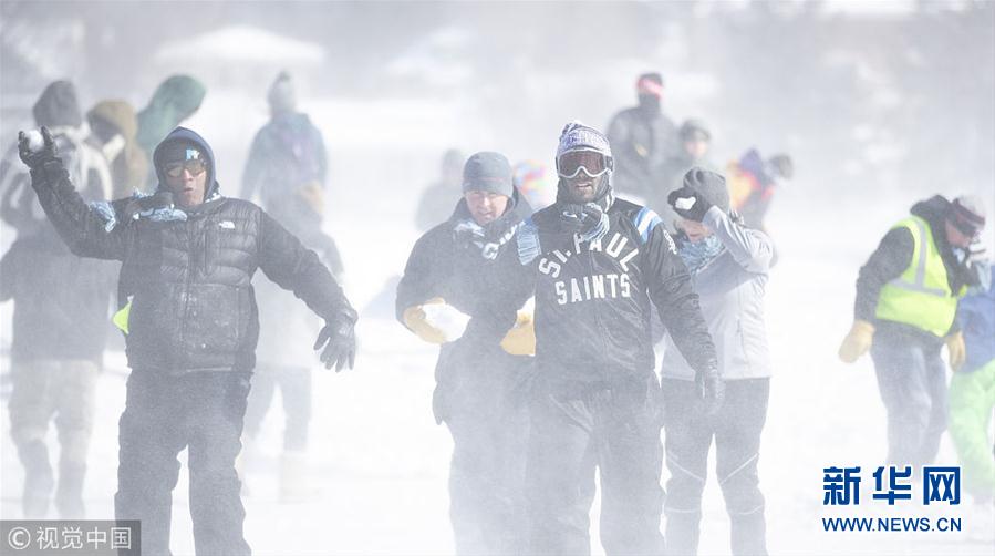当地时间2019年2月24日,美国明尼苏达州圣保罗,当地举办雪球大战,圣罗保和明尼阿波利斯两城人民进行打雪仗对决。(图片来源:视觉中国)