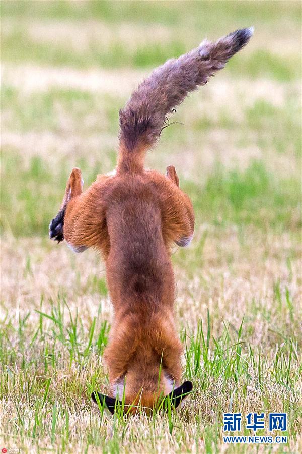 瑞典53岁的包装工程师Per Karlsson拍摄到一组狐狸捕食的搞笑照片。照片中,这只狐狸一头扎进草地上的一个田鼠窝,表演了一个精彩的“倒栽葱”。最后,它成功捕获到了3只田鼠,满载而归。(图片来源:东方IC)