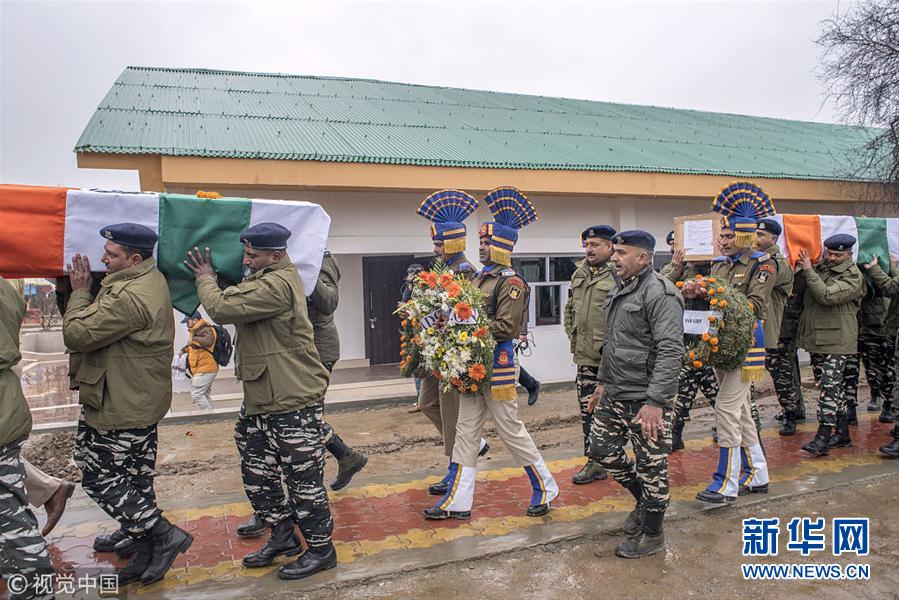 当地时间2019年3月2日,印控克什米尔斯利那加,枪战中殉职警察的葬礼举行。3月1日,至少4名印度政府军在与激进分子的枪战中丧生。(图片来源:视觉中国)