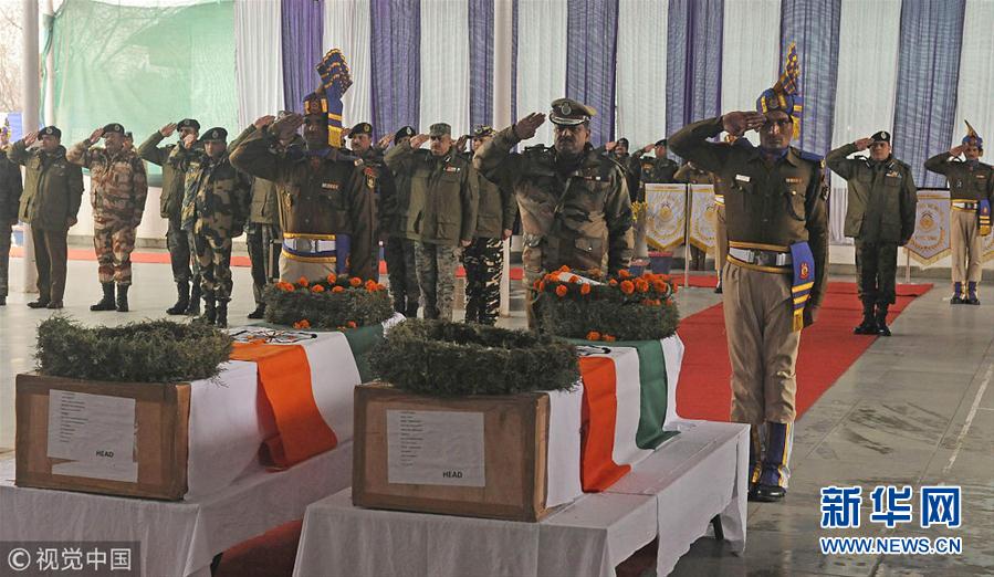 当地时间2019年3月2日,印控克什米尔斯利那加,枪战中殉职警察的葬礼举行。3月1日,至少4名印度政府军在与激进分子的枪战中丧生。(图片来源:视觉中国)