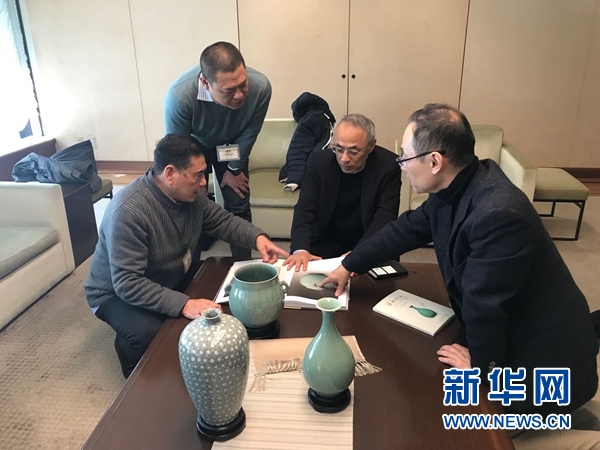 日本大阪市立东洋陶瓷美术馆馆长出川哲朗(右二)、日本古瓷研究专家小林仁博士(右一)、中国工艺美术大师毛正聪(左一)和浙江省工艺美术大师毛伟杰探讨龙泉青瓷。新华社记者李颖 摄