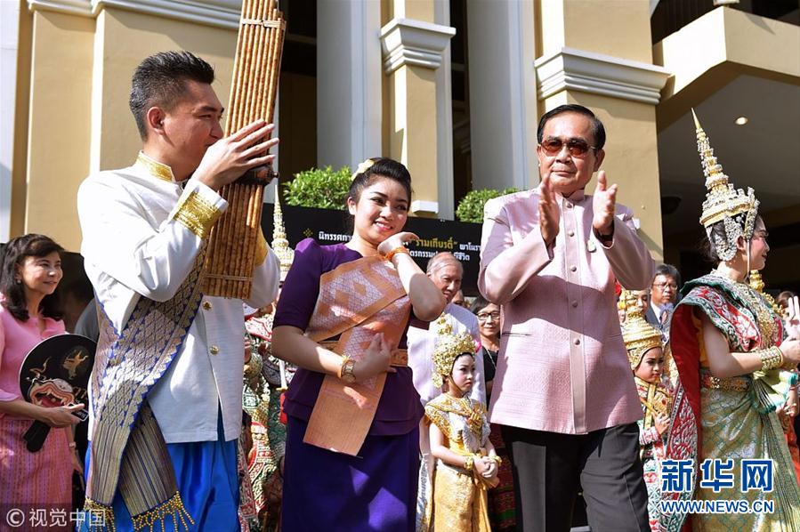 当地时间2019年3月5日,泰国曼谷,泰国总理巴育在艺术和手工艺博览会上与身穿传统服装的表演者互动。(图片来源:视觉中国)