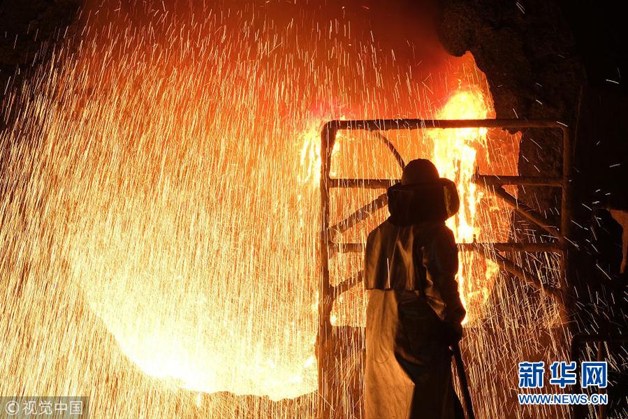 当地时间2019年3月5日,德国萨尔茨吉特,工人身着耐热服在钢铁厂里工作,火红的钢水四处飞溅。(图片来源:视觉中国)