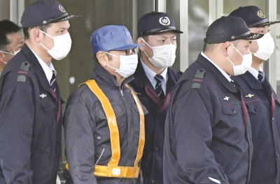 6日,戈恩(左三)离开位于日本东京的一处拘留所。 新华社发