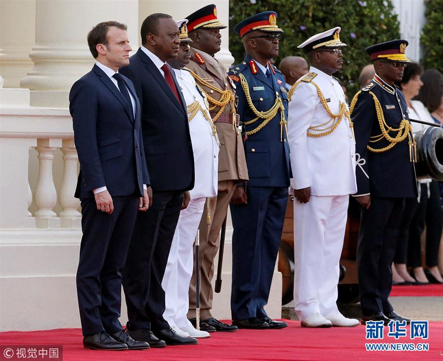 当地时间2019年3月13日,肯尼亚内罗毕,法国总统马克龙访问内罗毕,受到肯尼亚总统乌胡鲁·肯雅塔热烈欢迎,并出席仪仗队检阅仪式。 (图片来源:视觉中国)